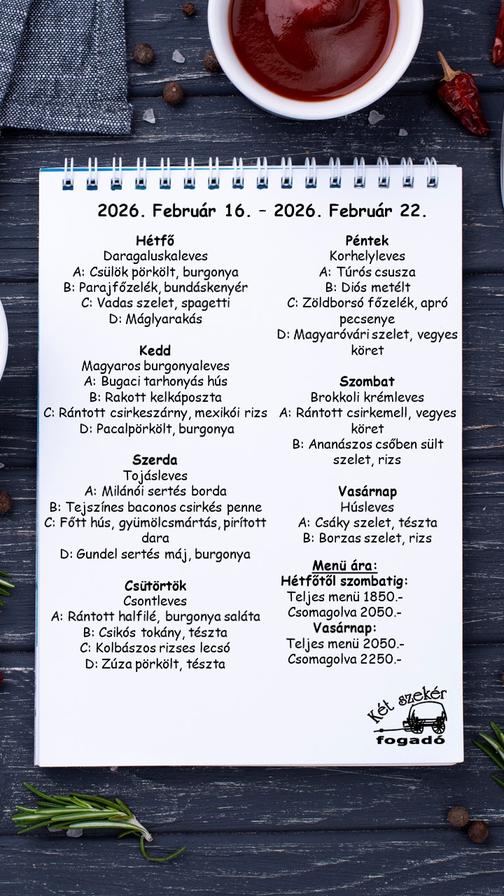 Teljes menü ára Hétfőtől szombatig: 1850.- Csomagolva 2050.-